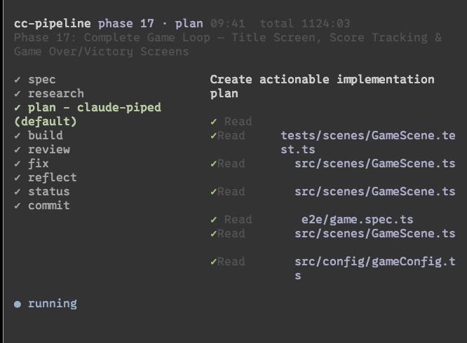 npx cc-pipeline runEach phase runs through the same sequence of steps: spec → research → plan → build → review → fix → reflect → status → commit (or add your own). The review step runs a staff-engineer-level critique of the code, I prefer to use codex at this phase, it outputs a REVIEW.md and a MUST-FIX.md file. The fix step addresses any must-fix findings. The reflect step looks back at the phase and plans the next one. Status updates STATUS.md at the project root — a running summary of what’s been built, test coverage, and what’s coming. Then a git commit.